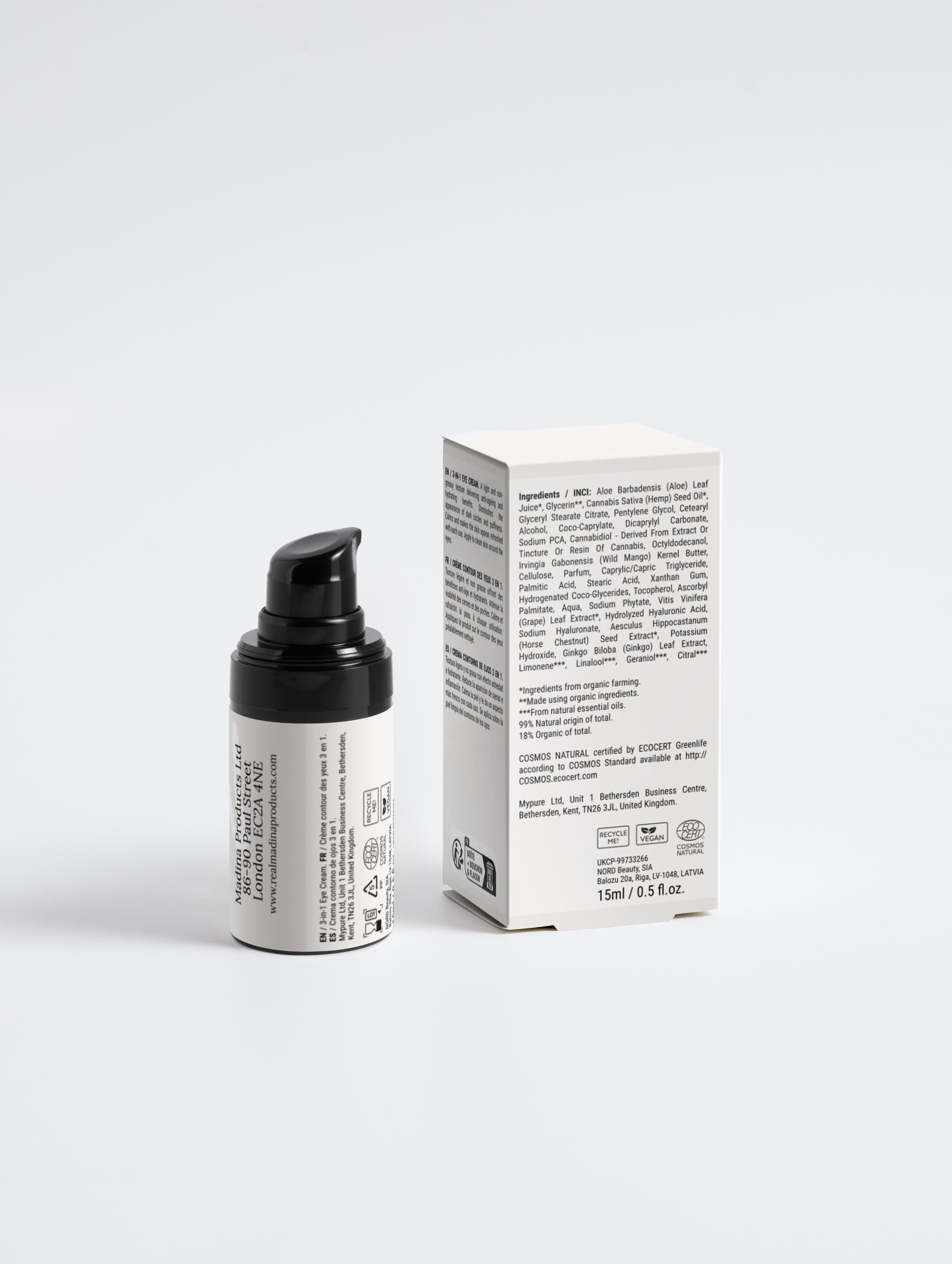Product description: This rejuvenating eye cream has a lightweight texture and goes beyond basic hydration, working diligently to diminish the appearance of dark circles and puffiness. Infused with 1% Cannabidiol to provide calming benefits and bring immediate comfort to the skin around the eyes. The eye area appears brighter, refreshed, and younger-looking with each use. Apply to clean skin around the eye area.